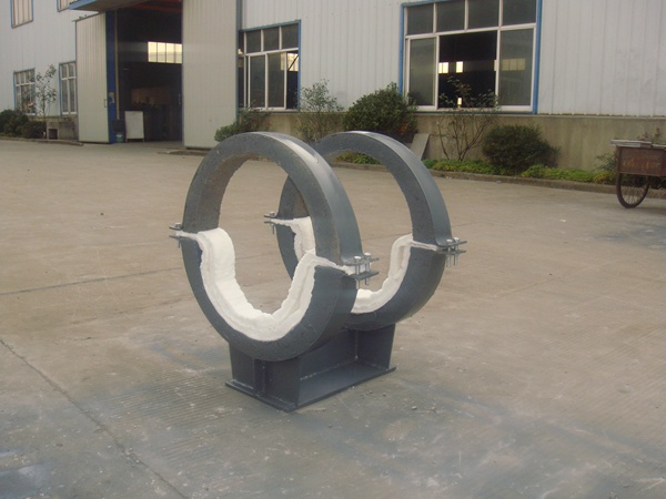 2、管夾內(nèi)配有硬質(zhì)保溫層和軟質(zhì)保溫層,其中管徑在DN500以下,軟質(zhì)保溫層厚度為20-30mm,硬質(zhì)保溫層為≥50-60mm,DN500以上為≥60-100mm,當(dāng)溫度t=250℃時,導(dǎo)熱系數(shù)為≤0.2W/m.k,抗壓強度為≥2.0Mpa。